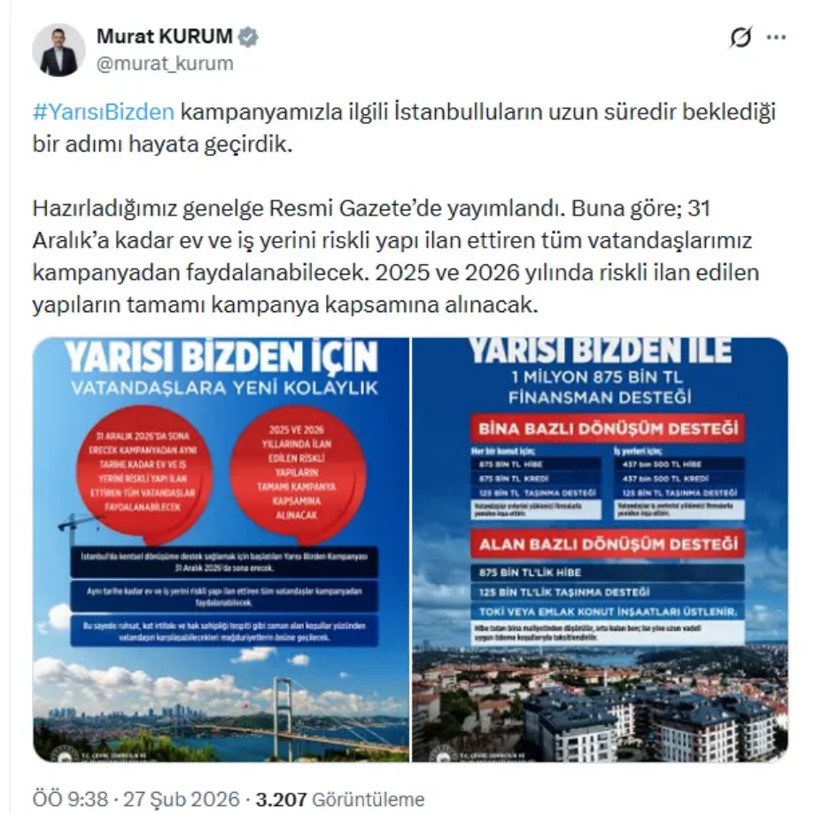 Genelgeyle ilgili sosyal medya hesabından paylaşım yapan Çevre, Şehircilik ve İklim Değişikliği Bakanı Murat Kurum, "Yarısı Bizden kampanyamızla ilgili İstanbulluların uzun süredir beklediği bir adımı hayata geçirdik. Hazırladığımız genelge Resmi Gazete'de yayımlandı. Buna göre; 31 Aralık'a kadar ev ve iş yerini riskli yapı ilan ettiren tüm vatandaşlarımız kampanyadan faydalanabilecek. 2025 ve 2026 yılında riskli ilan edilen yapıların tamamı kampanya kapsamına alınacak" mesajını verdi.