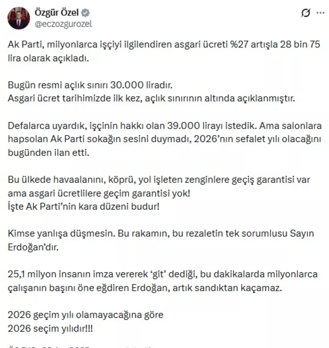Özel'in sosyal medyadan asgari ücretle ilgili yaptığı paylaşım şu şekilde;