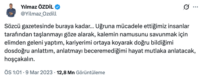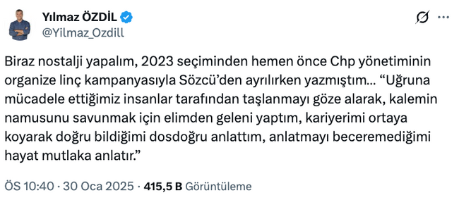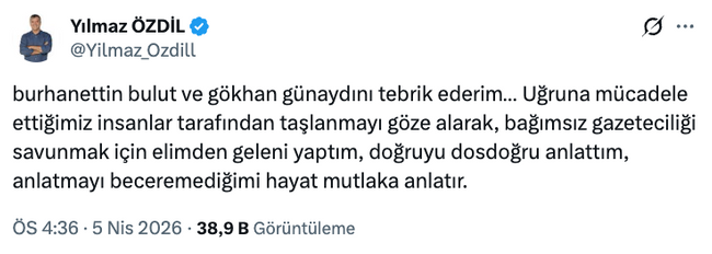 Asıl dikkat çeken detay ise kullanılan ifadelerin, 2023 yılında Sözcü’den ayrılırken yaptığı açıklamayla neredeyse aynı olması oldu. O dönem yaptığı veda paylaşımında da benzer cümleler kuran Özdil’in bu çıkışı, yeniden bir ayrılık ihtimalini gündeme taşıdı.