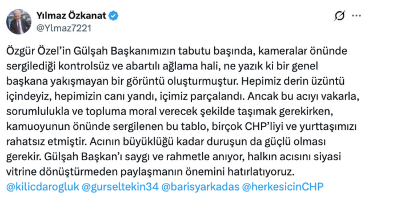 "Özgür Özel’in Gülşah Başkanımızın tabutu başında, kameralar önünde sergilediği kontrolsüz ve abartılı ağlama hali, ne yazık ki bir genel başkana yakışmayan bir görüntü oluşturmuştur.