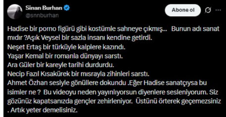 Sinan Burhan, paylaşımında Hadise’nin sahne tarzını sert ifadelerle eleştirerek, “Hadise p.rno figürü gibi kostümle sahneye çıkmış… Bunun adı sanat mıdır?” dedi.