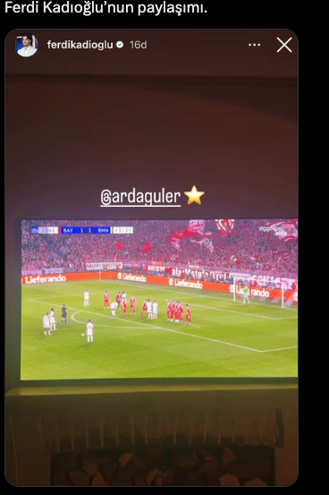 Real Madrid forması giyen milli yıldızımız Arda Güler, Şampiyonlar Ligi'nde Bayern Münih'i iki kez uzaktan avladı. Bunlardan ikincisi, harika bir frikik sonrasında gelmişti. Brighton forması giyen eski Fenerbahçeli Ferdi Kadıoğlu da bu golü paylaşarak yıldız emojisi kullandı.