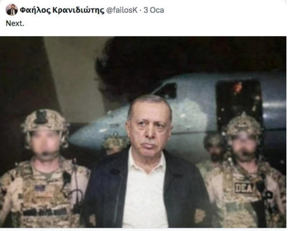 Yunanistanlı siyasetçi Failos Kranidiotis'ın Cumhurbaşkanı Erdoğan'ın ABD askerleri tarafından tutuklandığını gösteren yapay zeka destekli fotoğrafı sosyal medyada yayınlaması tepkilere neden oldu.