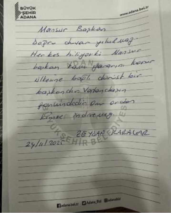 Zeydan Karalar'ın sosyal medya hesabından, hakkında soruşturma izni verilen Mansur Yavaş'a ilettiği not paylaşıldı. Karalar, notta şunları kaydetti: